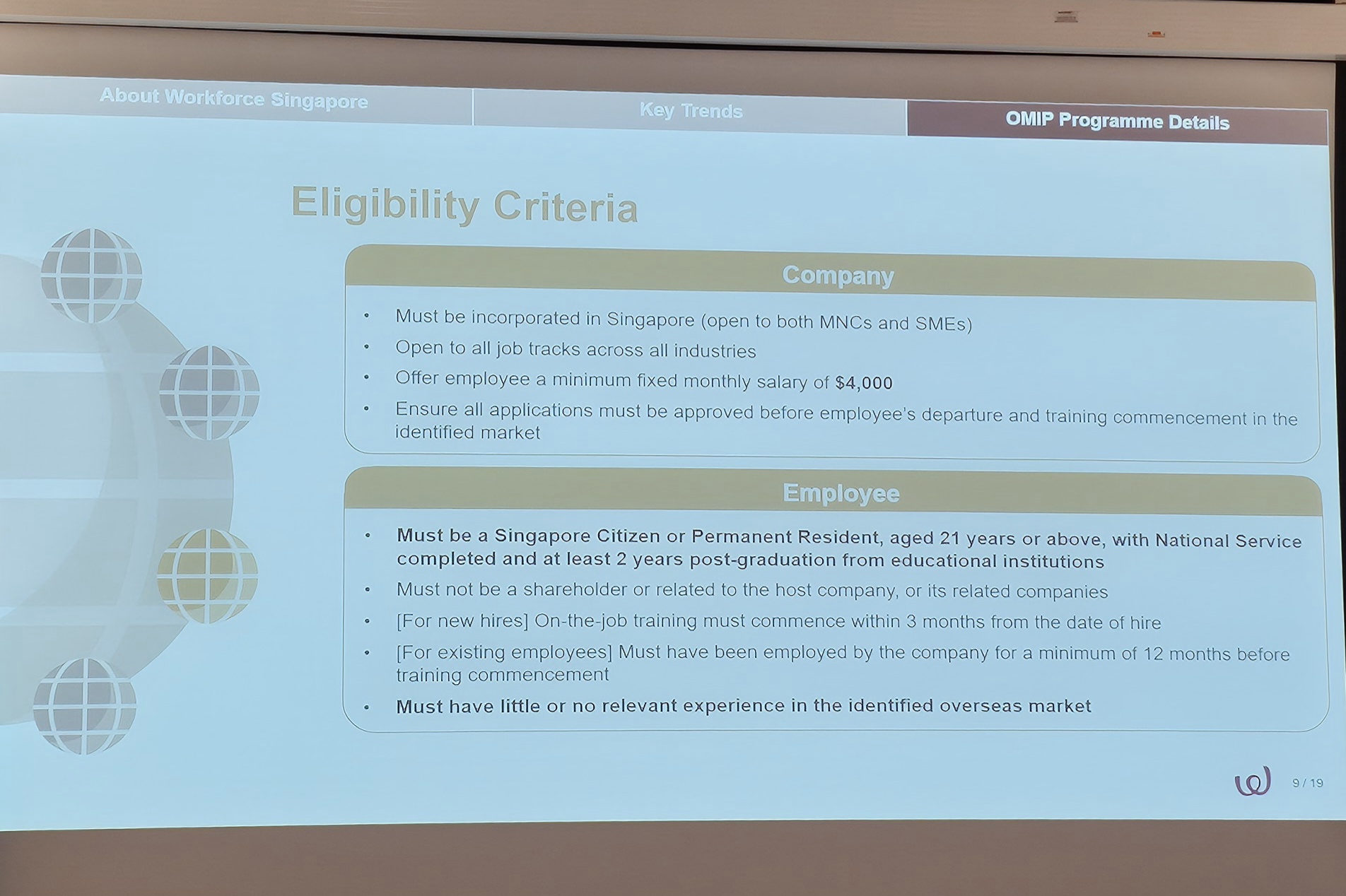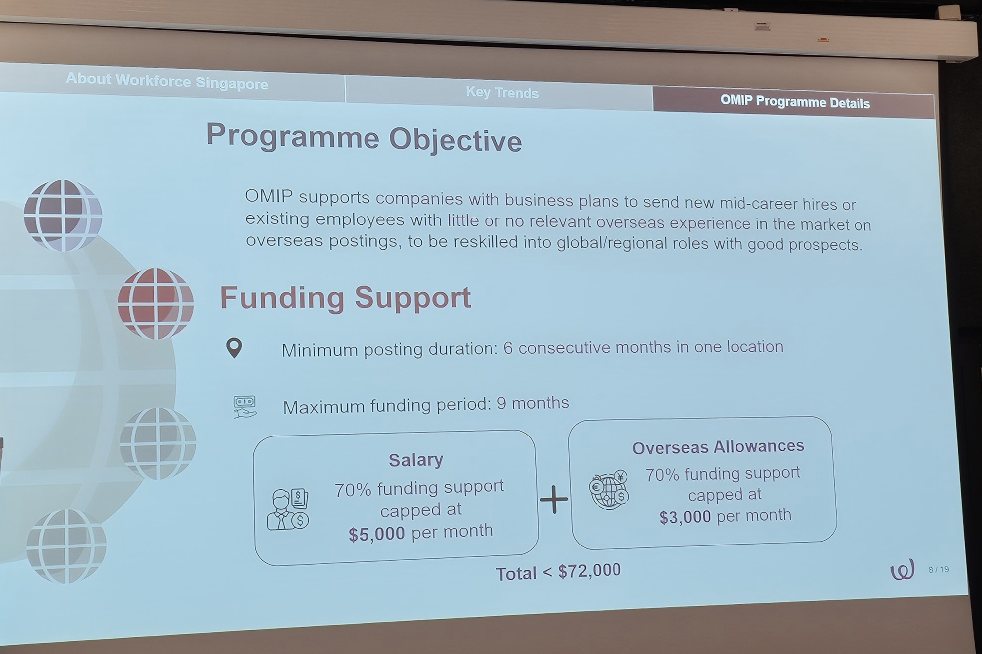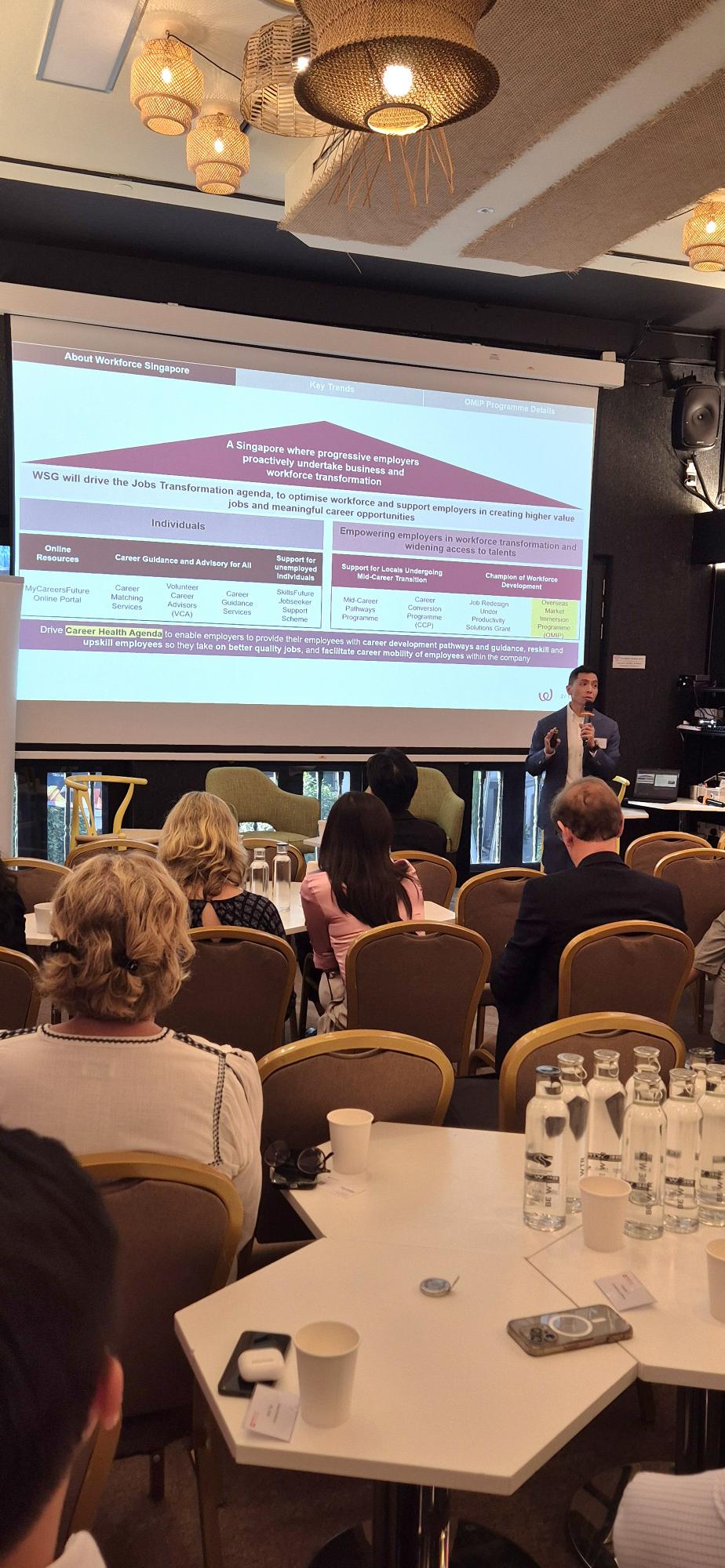 It was an insightful session as Kenneth Wong from Workforce Singapore shared with us how a company with global expansion can tap into Workforce Singapore's Overseas Markets Immersion Programme (OMIP) to send new mid-career hires or existing employees with little or no relevant overseas experience on overseas postings, to be reskilled into global/regional roles with good prospects. The funding support is for overseas assignment from 6 months to 9 months.